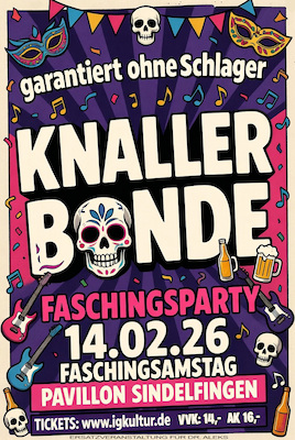 KNALLERBANDE - Gegründet im Jahr 2021 irgendwo zwischen Böblingen und Größenwahn, spielen sie die besten Songs der besten Bands – kompromisslos, laut, leise, von hart bis zart, und immer mit dem festen Willen, dass niemand nüchtern oder unbewegt nach Hause geht.