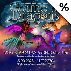 Bis 11. Januar öffnen sich im „Lucky Star“ in München Milbertshofen die Tore zu einem atemberaubenden Drachenlichterpark - das derzeit spektakulärste Family-Fantasy-Erlebnis als Teil einer offenen, lebendigen Stadt. In der immersiven Outdoor-Ausstellung „Game of Dragons“ erwachen mit kraftvollen Flügelschlägen majestätische Kreaturen und laden ein zum gemeinsamen Mitmachen, Erleben und Begegnen.