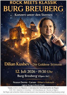 Mit seiner außergewöhnlichen Stimme begeistert der international bekannte Bariton Dilian Kushev – „Die Goldene Stimme“ – seit Jahren sein Publikum bei Konzerten in ganz Europa.