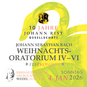 Ein besonderer Anlass, ein besonderer Ort und ein besonderes Werk: Zum zehnjährigen Bestehen der Johann-Rist-Gesellschaft e.V. laden wir herzlich ein zu einem festlichen Konzert mit Teilen IV–VI von Johann Sebastian Bachs Weihnachtsoratorium. Das Jubiläumskonzert findet am Sonntag, den 4. Januar 2026 um 18:00 Uhr in der Immanuelkirche Wedel statt – jener Kirche, in der Johann Rist als Pastor wirkte.